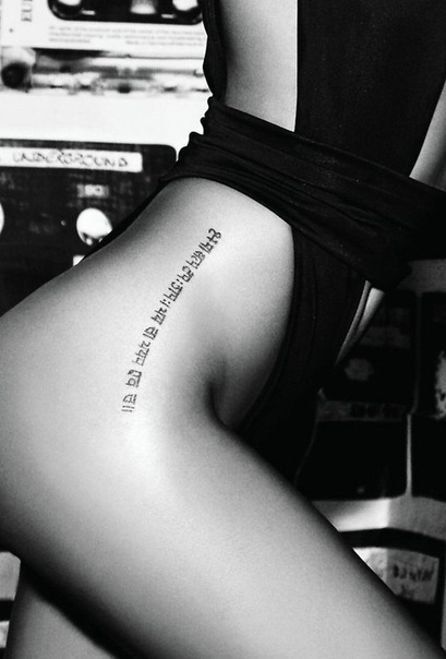 4. Наступна татуювання Ріанни розташована на правому боці: фраза на санскриті. Напис було взято з святого письма Гіта і нанесена в Нью-Йорку професійним татуювальників БенгБенгом (BangBang).