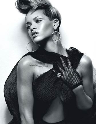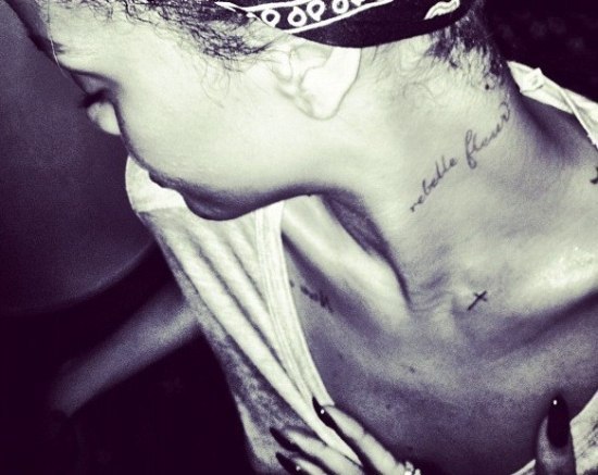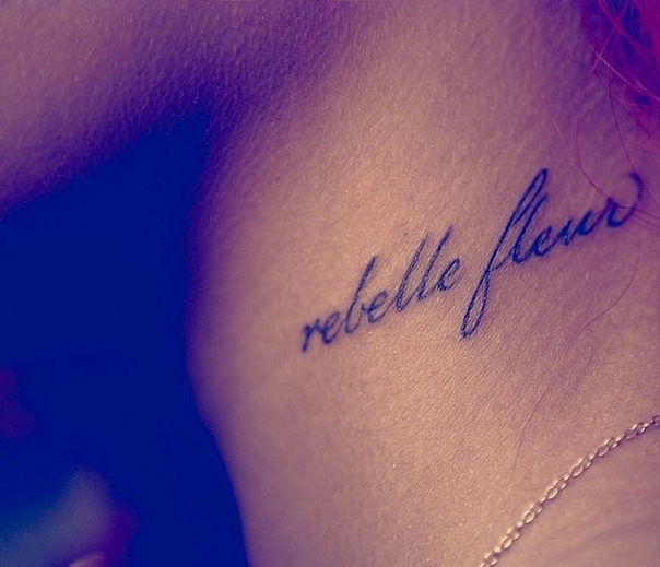 14. 9 серпня 2010 Ріанна відвідала тату салон в Нью-Йорку, де зробила чергове татуювання, на цей раз з лівого боку шиї у вигляді напису на французом «Rebelle Fleur», що означає «бунтівний квітка».
